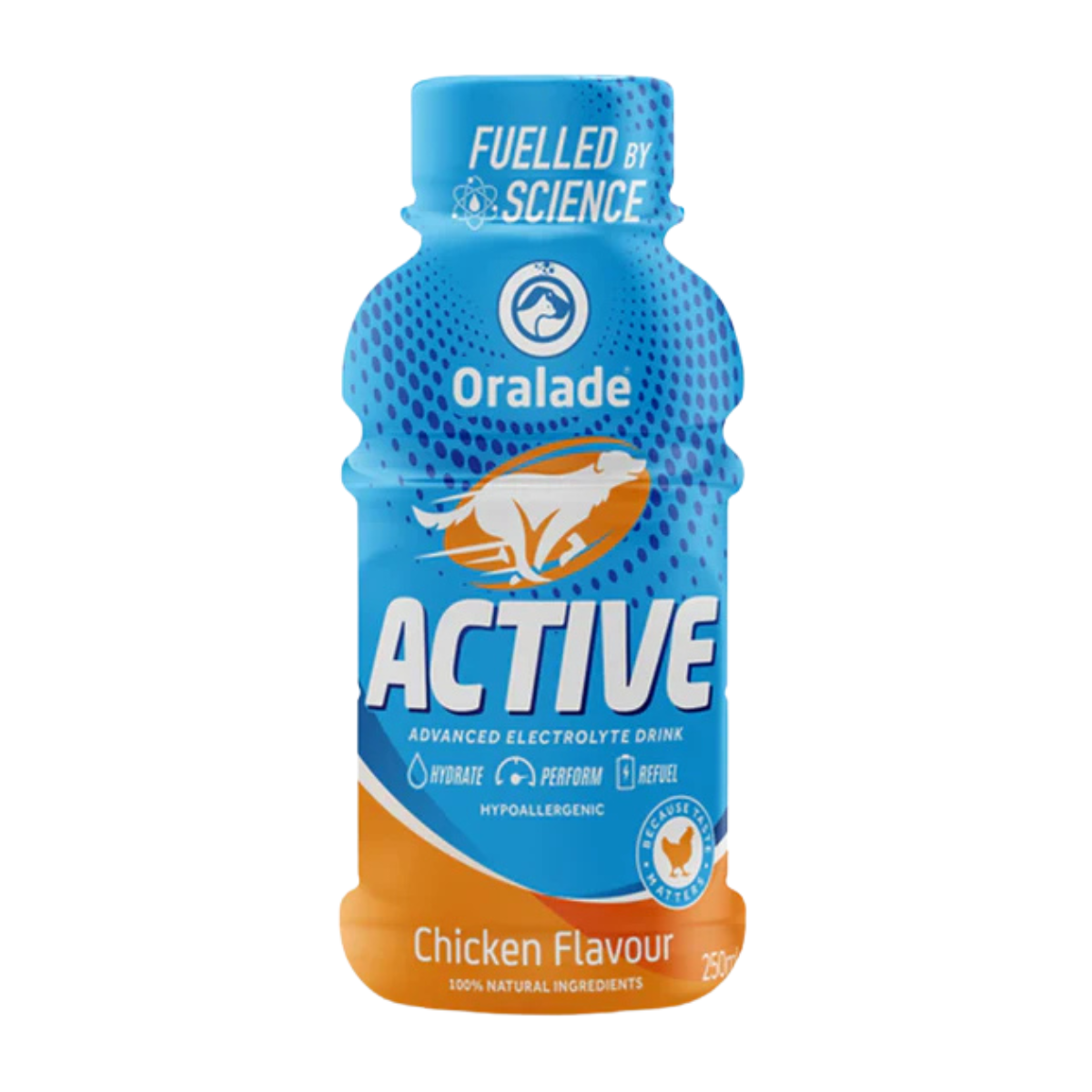 Oralade Active 高效電解質飲料能為您的狗狗提供快速且有效而美味的水份及電解質補充,100%天然雞肉味。